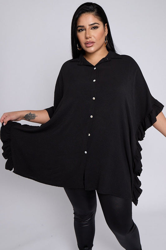 Isla PLUS SIZE Black Button Through Short Sleeve Shirt With Frill Side Detail