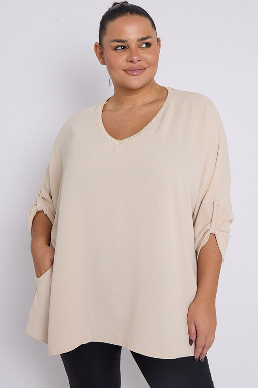 Anya PLUS SIZE Beige V Neck Contrast Trim 3/4 Turn Sleeves Top With Pockets