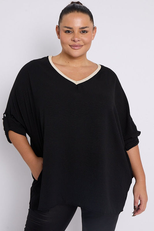 Anya PLUS SIZE Black V Neck Contrast Trim 3/4 Turn Sleeves Top With Pockets